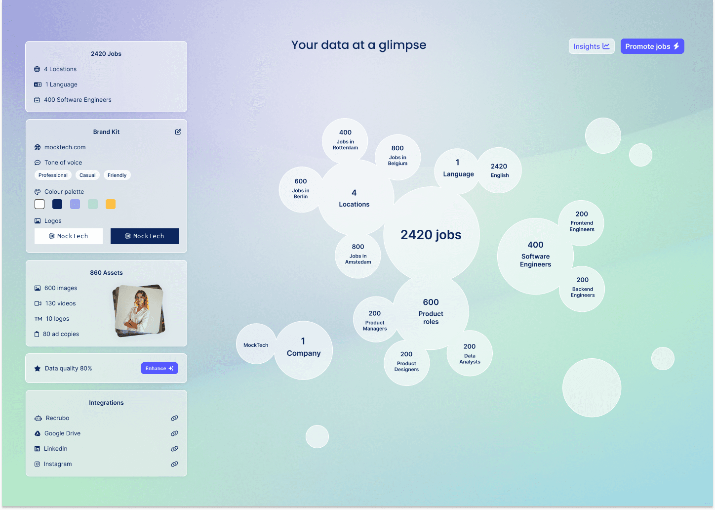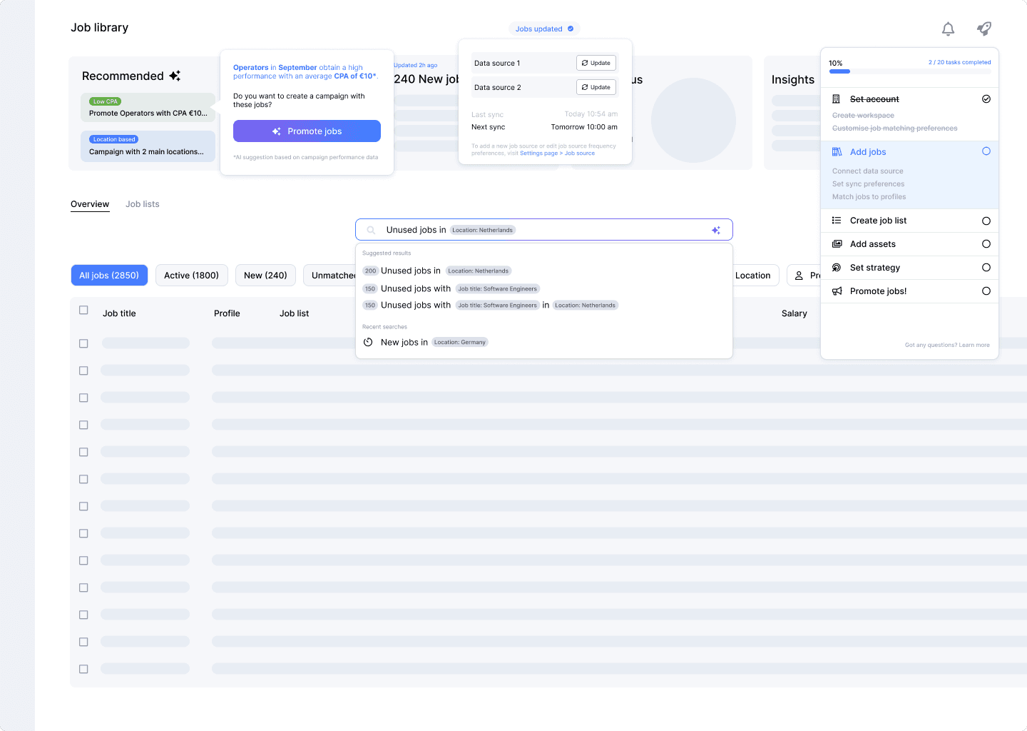 A storytelling-infused flow welcomes our new customers to Inspire. A clean, structured UI first gathers recruitment goals and campaign strategies before prompting users to connect their data source. This approach ensures we collect everything needed upfront while keeping the process simple and engaging.